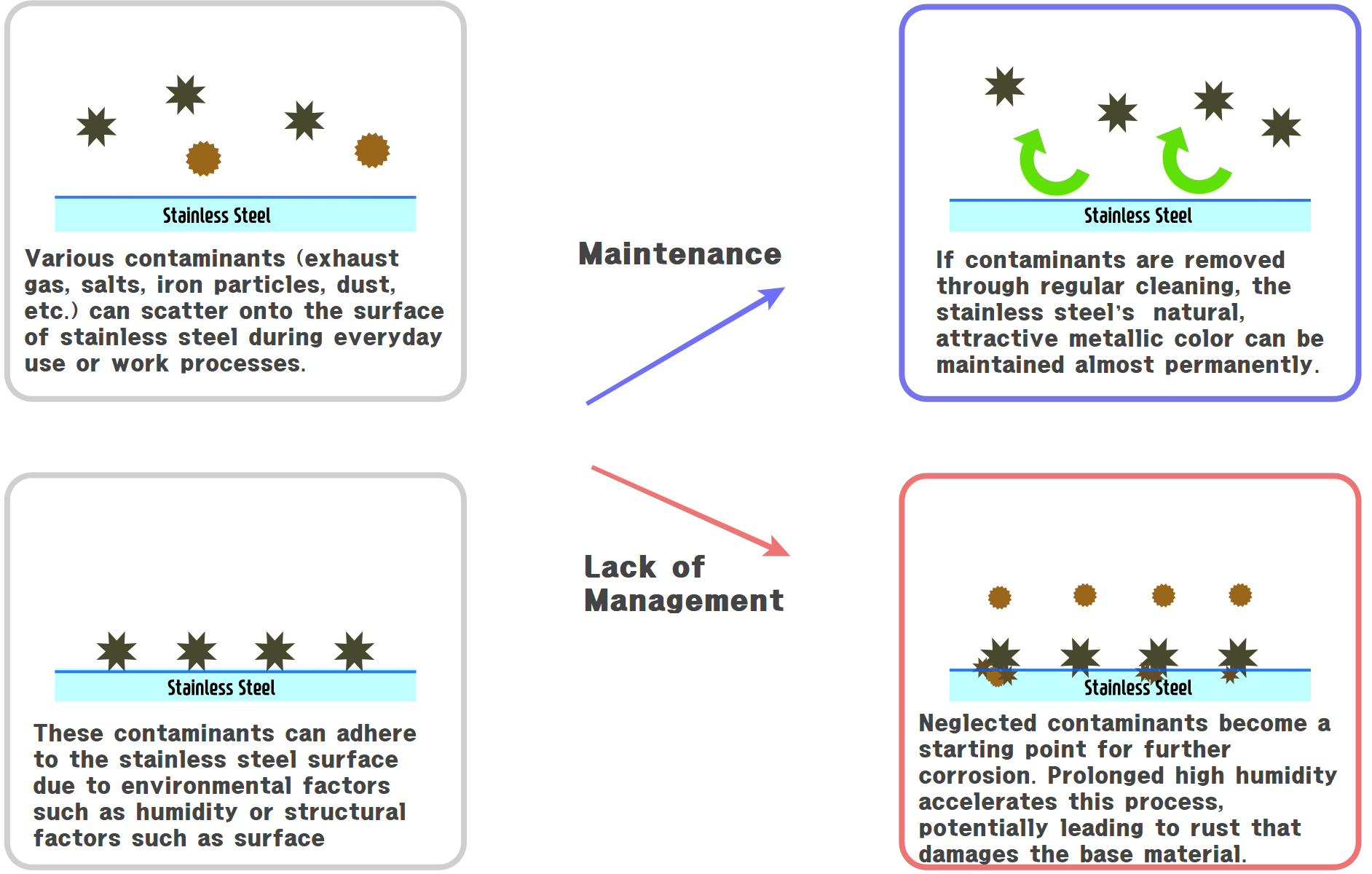Also, in factory areas, when processing using the same equipment as steel products, iron-based heterogeneous metal particles often attach to the stainless surface and contaminate it. Galvanic corrosion occurs due to the standard electrode potential difference between the two metals on the surface, causing rust on the foreign matter, and this foreign matter affects the stainless steel itself in the long term, so periodic cleaning is necessary.