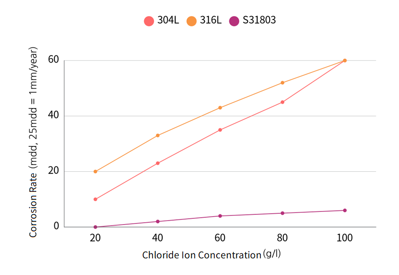 Corrosion refers to the change in steel properties due to the influence of chemical atmosphere or temperature. Duplex has stronger corrosion resistance than general austenitic steel in most chemical atmospheres. The resistance of duplex in various types of corrosive atmospheres is introduced in more detail below.