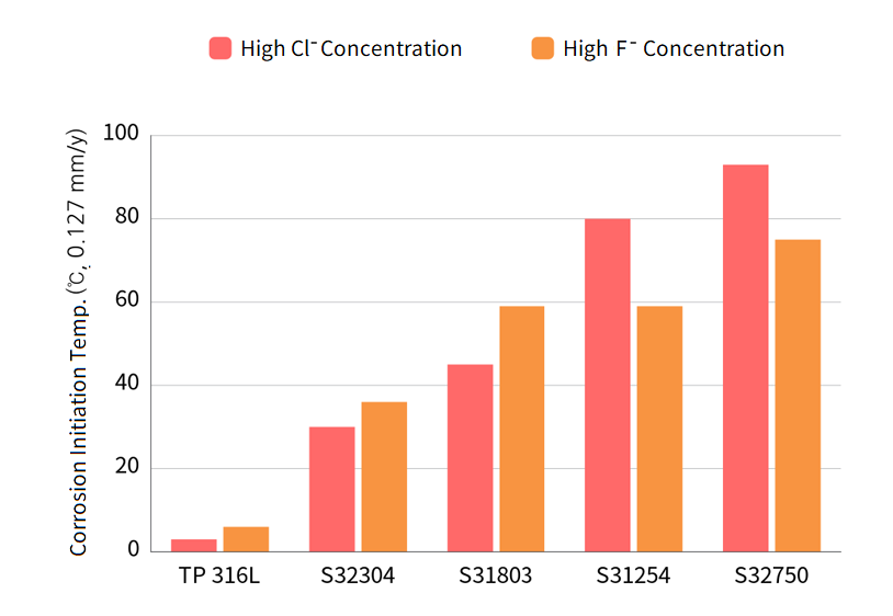 In strong hydrochloric acid atmosphere, most stainless steels are vulnerable to corrosion. In diluted hydrochloric acid atmosphere, super duplex has corrosion resistance similar to nickel steel Alloy 28 or super austenitic series steel. In 3% diluted hydrochloric acid atmosphere, super austenitic steel S32760 has corrosion resistance below 80°C.